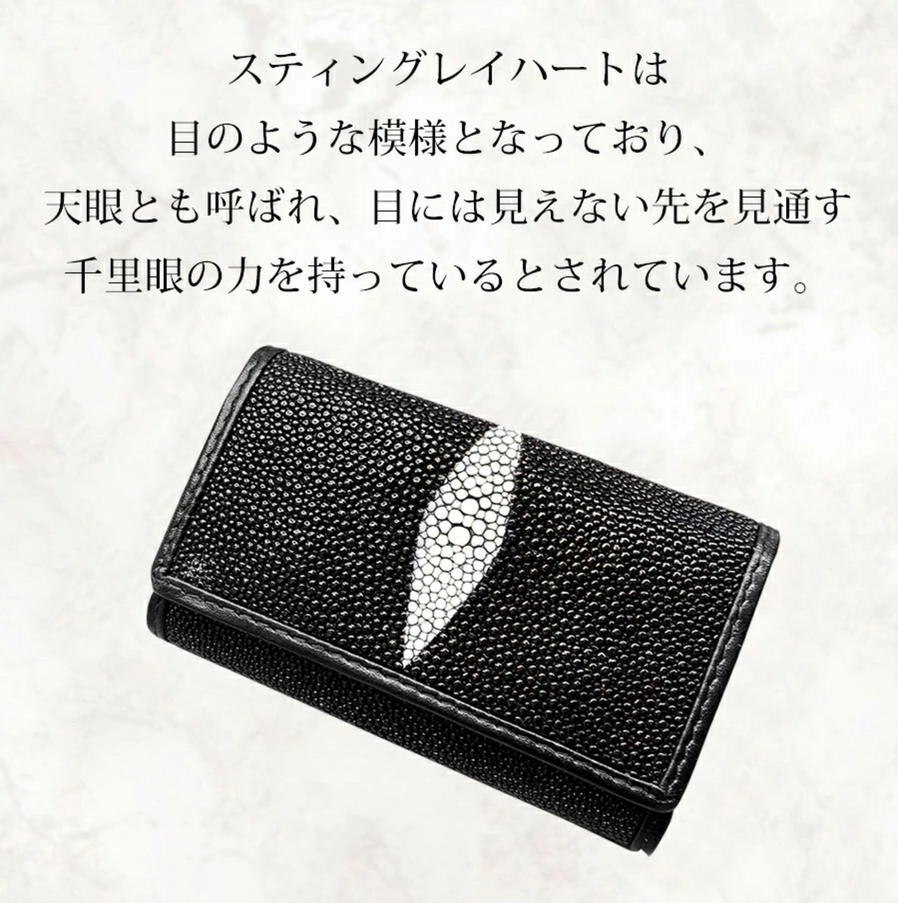 エイ革の財布・キーケースにはスティングレイハートと呼ばれるシンボルがあり、一匹のエイには1ヶ所のみ存在するもの。